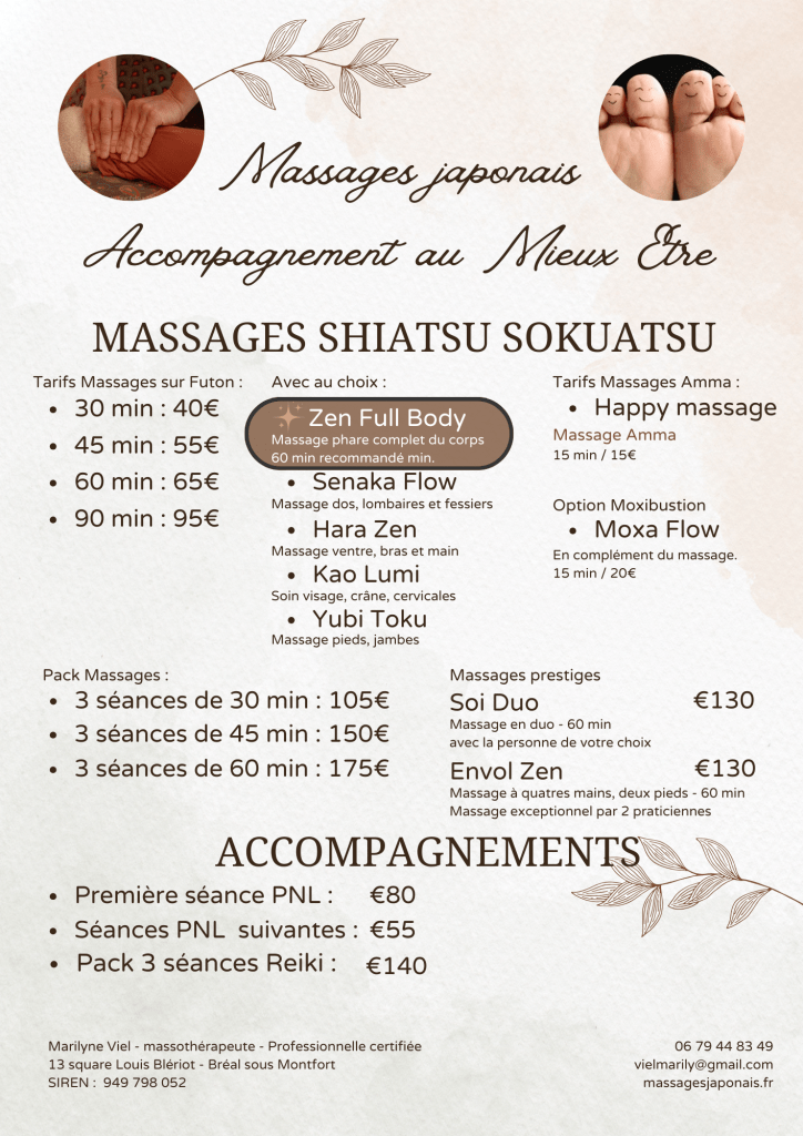Le Zen Full Body est un massage complet inspiré des techniques japonaises du Shiatsu et du Sokuatsu.